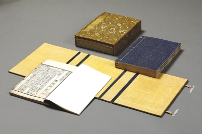 此次展覽名為“縹緗流彩”——“縹”意為淡青色,“緗”則是淺黃色,古代人常用淡青、淺黃的絲帛作書(shū)囊書(shū)衣,“縹緗”用以指代書(shū)卷,也暗含書(shū)籍裝潢的意味。展覽分為“護(hù)帙”和“飾觀”兩大板塊,“護(hù)帙”篇體現(xiàn)各種書(shū)籍裝潢樣式,“飾觀”篇著重關(guān)注繪畫(huà)、書(shū)法、篆刻等在裝潢過(guò)程中的應(yīng)用,另有“書(shū)具之美”“書(shū)衣之美”兩個(gè)單元,呈現(xiàn)特別精美的書(shū)具、書(shū)衣。