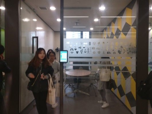 圖片說明:研討室一邊是彩色畫板,另一邊是吸音材料。