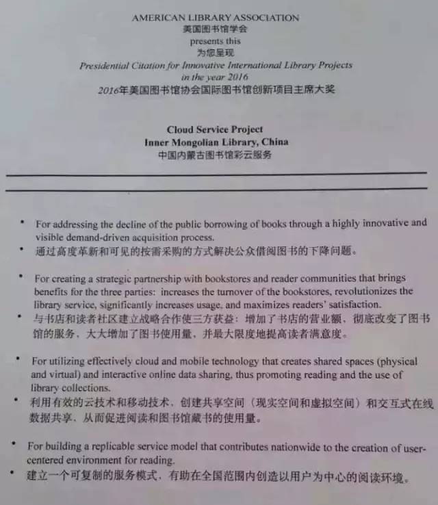 2016年美國圖書館協(xié)會(huì)國際圖書館創(chuàng)新項(xiàng)目主席大獎(jiǎng)-中國內(nèi)蒙古圖書館彩云服務(wù),獲獎(jiǎng)理由: